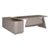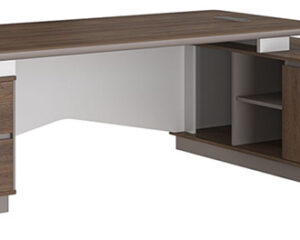 Bàn lãnh đạo LUXB2218S5 chất liệu gỗ sơn + Melamine, hộc và tủ phụ liền bàn, ngăn kéo sử dụng khóa vân tay, yếm bàn soi chỉ trang trí ốp ngoài sơn trắng. Sản phẩm kết hợp vân gỗ, sơn ghi, trang trí thêm màu trắng. Mặt bàn có 01 nắp hộp điện, kết hợp đi dây hiện đại, tiện ích.